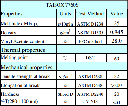 7760S is an ethylene/vinyl acetate copolymer. The trade name is Taisox. This product is manufactured by the high-pressure process. By incorporating vinyl acetate (VA) into the ethylene chain, co-polymerization produces EVA.