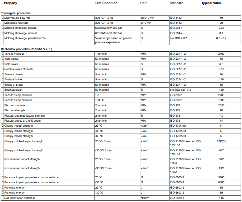MVR (300°C/1.2 kg) 19 cm³/10 min; Automotive lighting; low viscosity; UV stabilized; easy release; injection molding - melt temperature 280 - 320°C; available in clear transparent colors and in various signal colors; headlamp lenses for automotive forward lighting