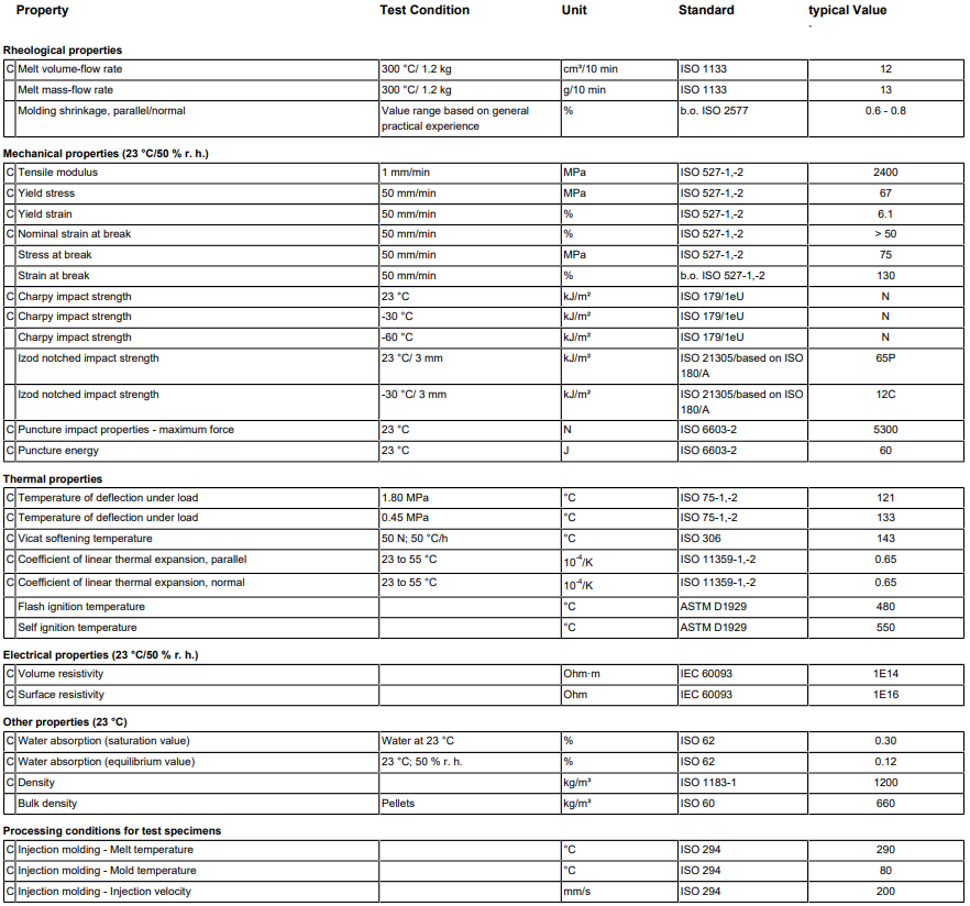 MVR (300°C/1.2 kg) 12 cm³/10 min; medical devices; suitable for sterilization with high-energy radiation; biocompatible according to many ISO 10993-1 test requirements; medium viscosity; easy release; injection molding - melt temperature 280 - 320°C; available in color code 451118 only; transparent parts for medical devices
