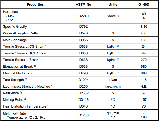 SKYPEL G140D offers enhanced performance upon high thermal stability and flexural modulus. Outstanding characteristics of SKYPEL G140D are listed below.